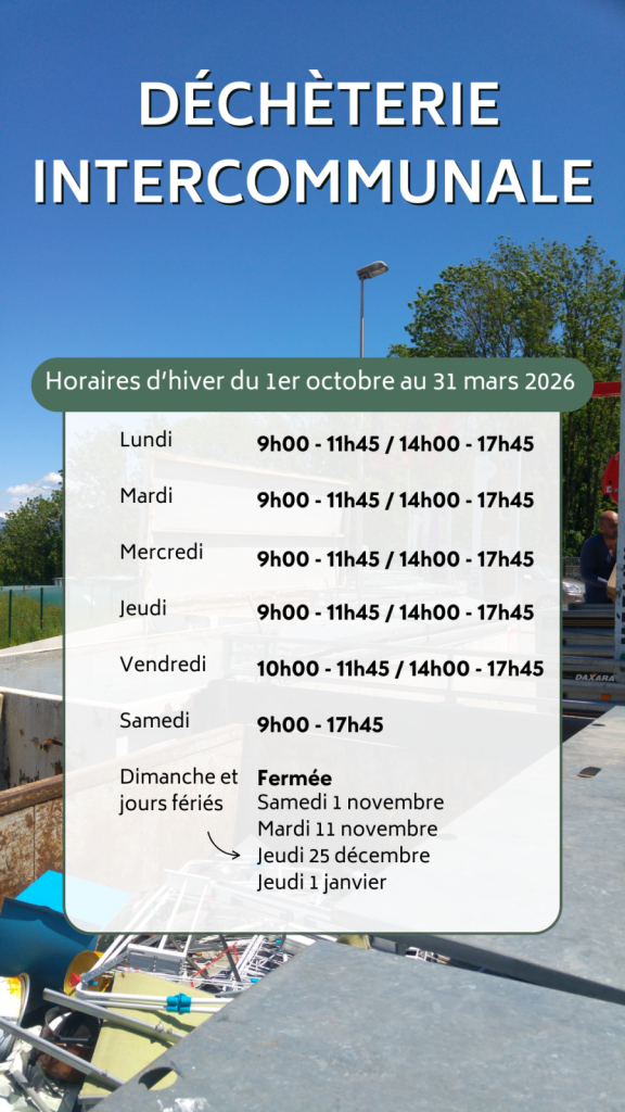 À partir du 1er octobre et jusqu’au 31 mars 2026, la déchèterie adopte ses horaires d’hiver :